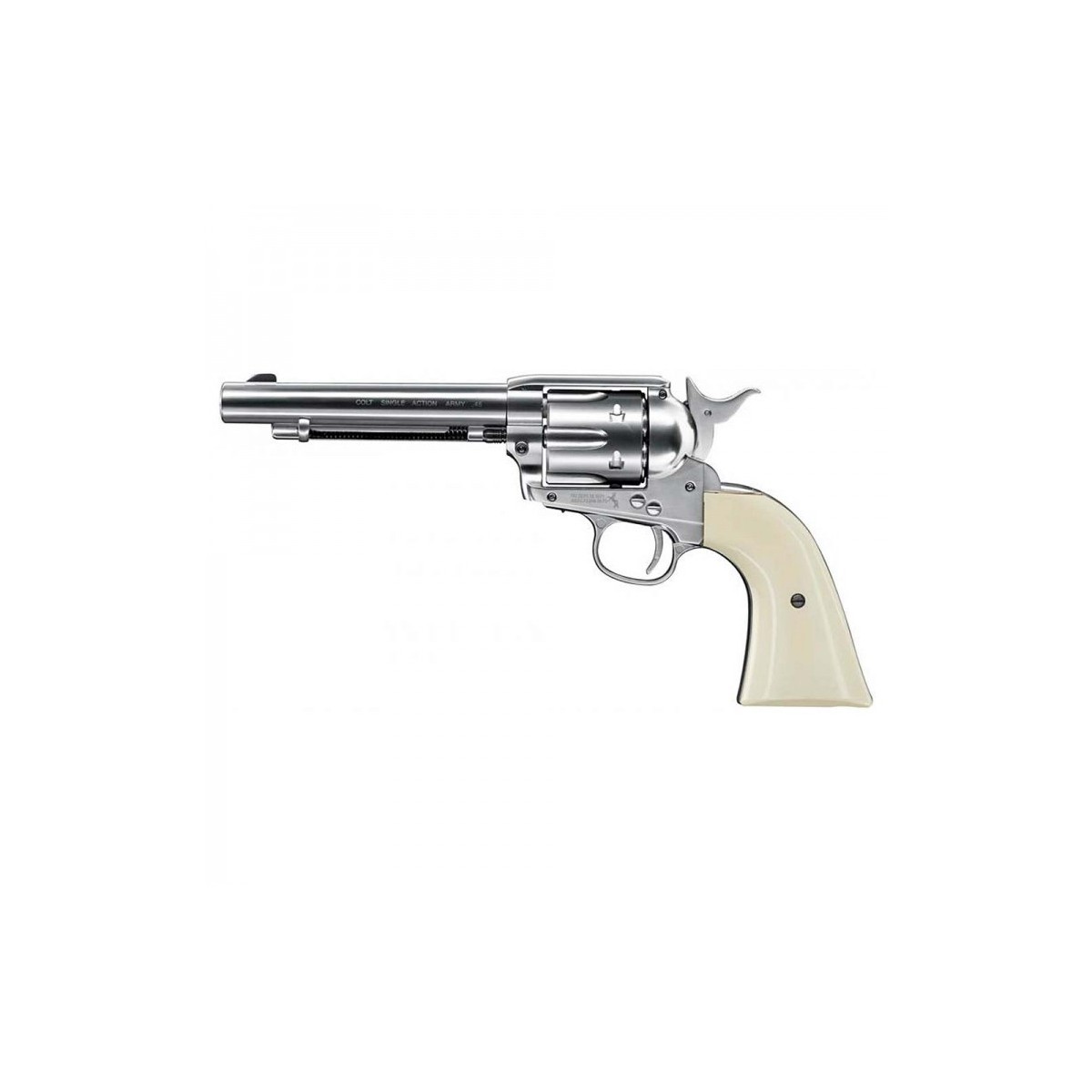 CARACTERÌSTICAS - Réplica de la legendaria Peacemaker - Calibre: 4,5mm(.177) - Cañón estriado. - Seis cartuchos metálicos para perdigones. - Velocidad: 115 m/s (377 ft/s). - Disparos por cápsula: 120 APROX. - Gatillo: SA. - Longitud: 275 mm. - Peso: 867 g. -Nickel finish.