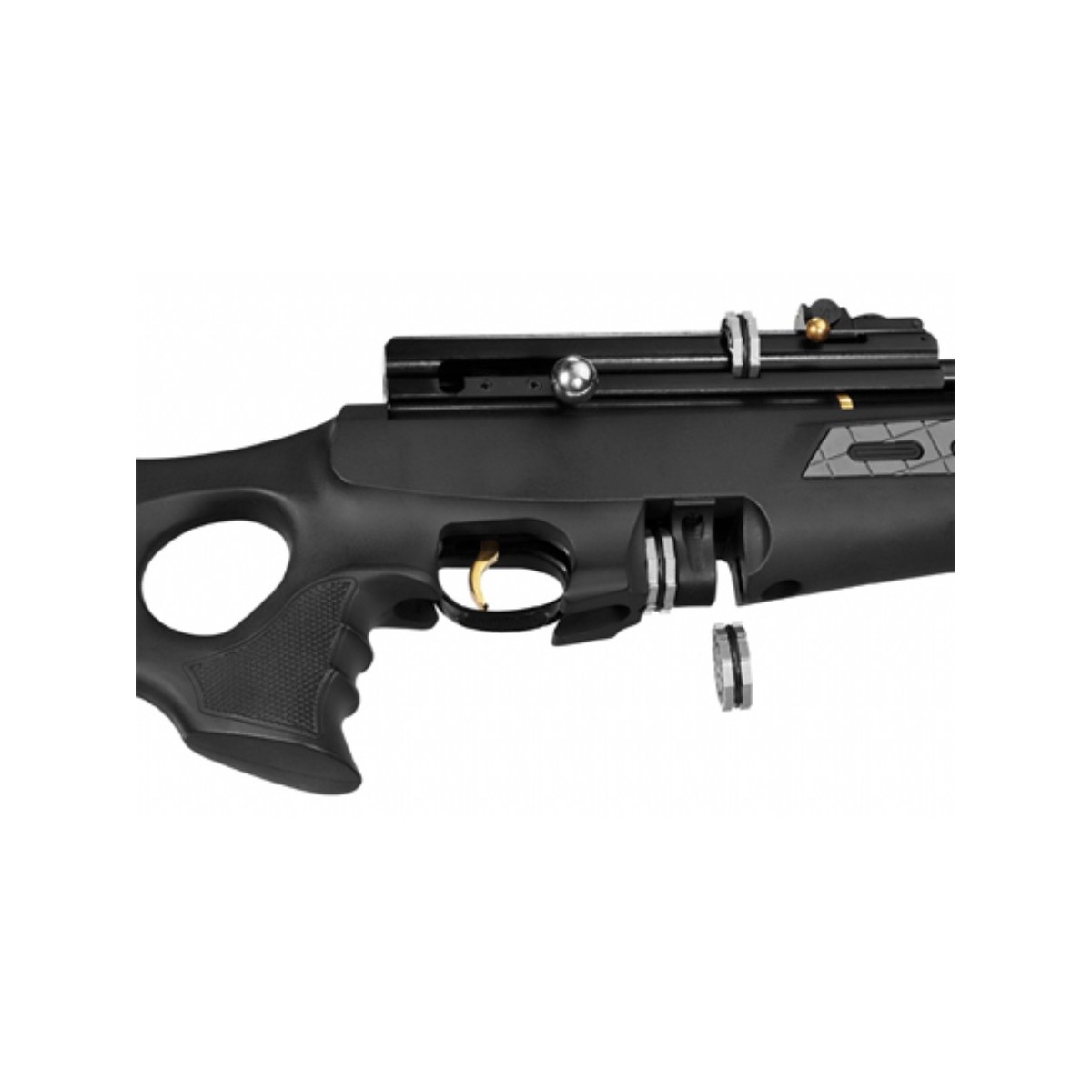 • Carabina de aire Precomprimido neumático (PCP) de carga manual mediante cerrojo lateral.