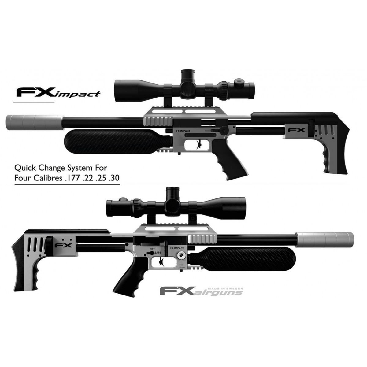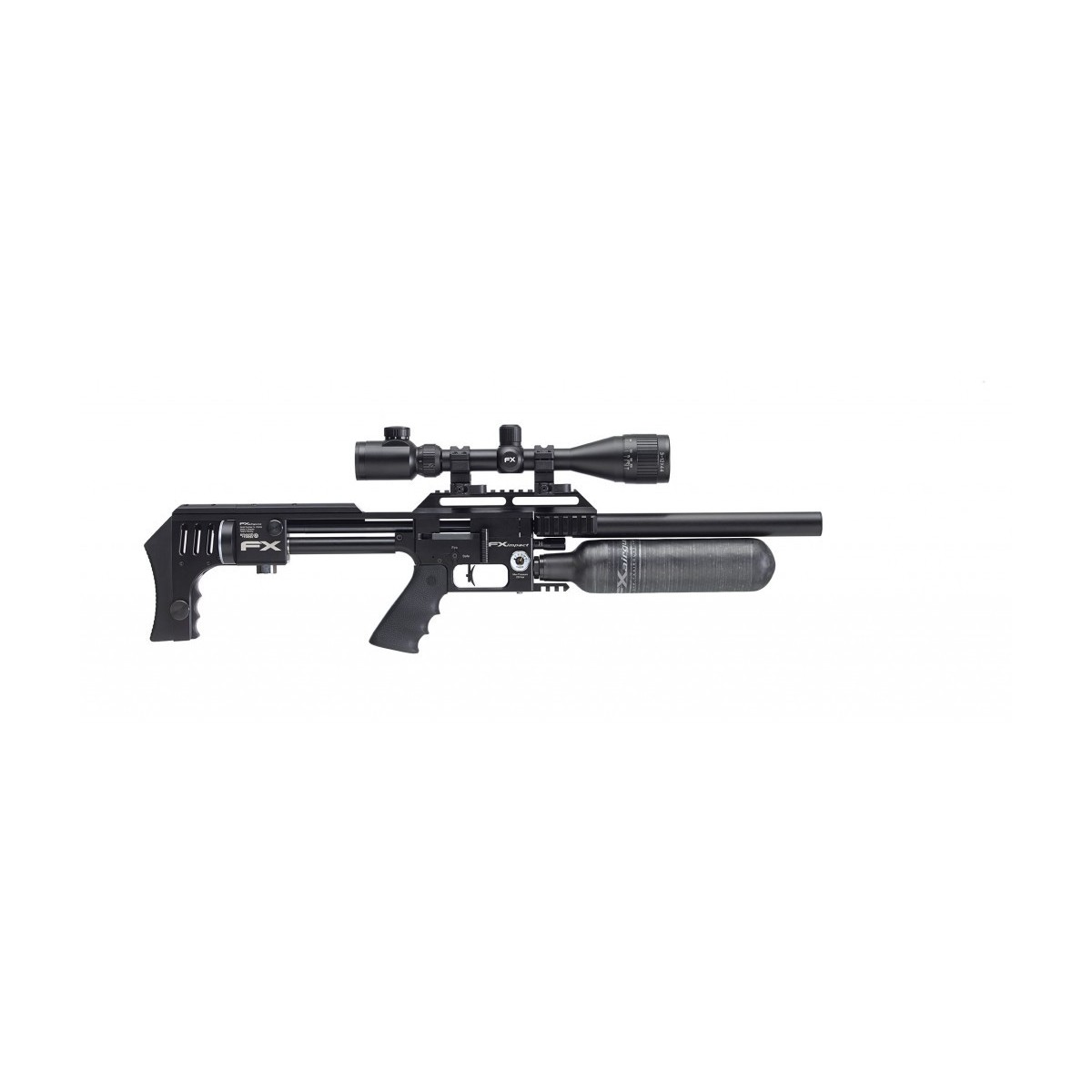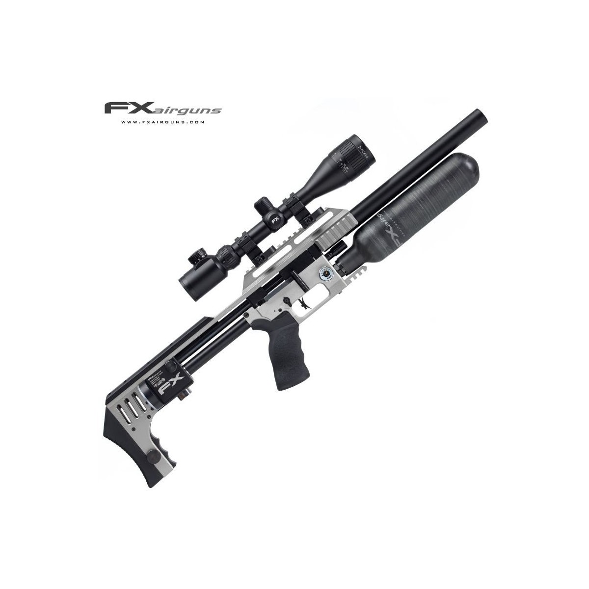 Ajuste de potencia (tensión del martillo) Regulador de la válvula (ajuste del flujo de la válvula) Sistema de Calibre Intercambiable Múltiples rieles accesorios (picatinny) lados y fondo Disparador de partido