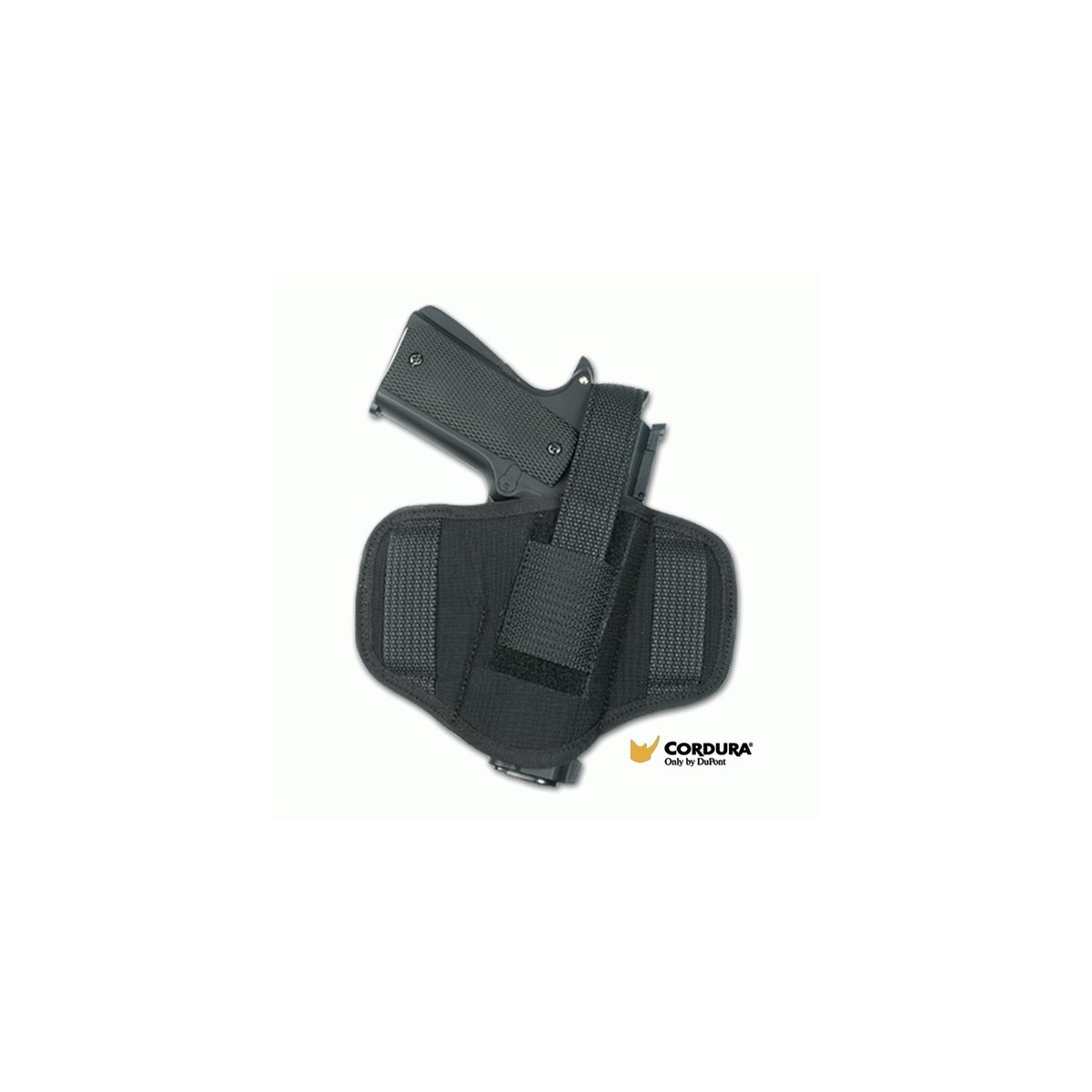 Funda riñonera fabricada con material Cordura, en color negro. Válida para alojamiento de pistola BERETTA 92 FS, H&K USP, H&K USP COMPACT, WLATHER P99, WALTHER P99 COMPACT, WALTHER PPK, STAR 30M, STAR 28PK, GLOCK 17 y REVOLVER 2'- 4'. De extracción rápid