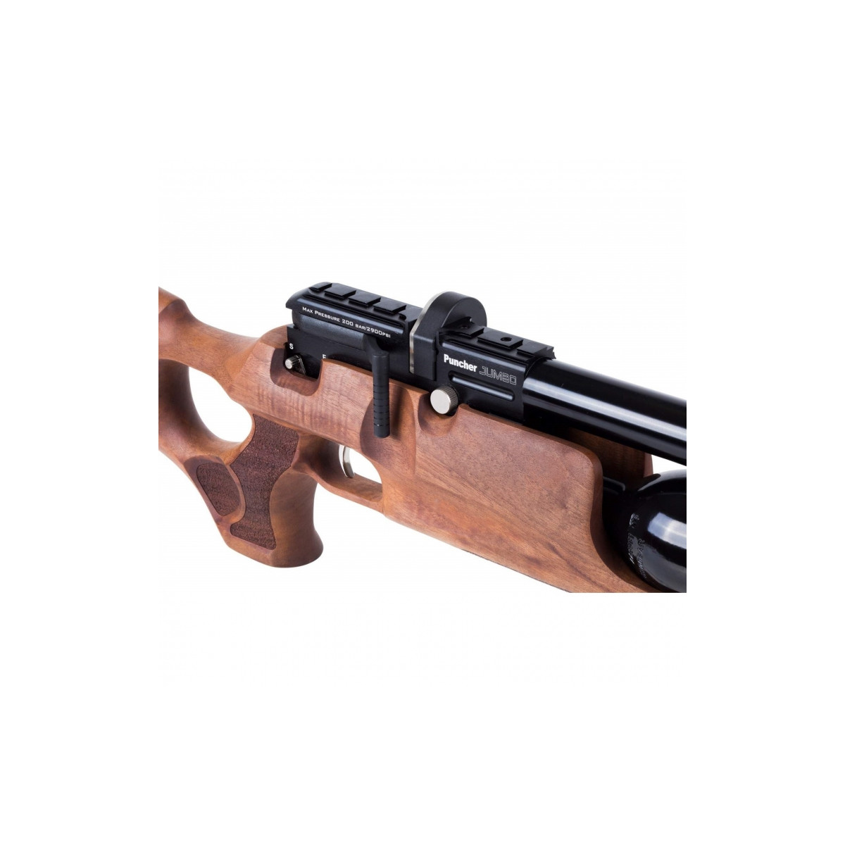 CARACTERÍSTICAS: - No incluye visor. - PCP. - Calibre: 5,5 mm. - Capacidad cargador: 12 Shots 5,5 mm. - Capacidad del cilindro: 425 cc.. - Presión de llenado: 200 Bar. - Culata de madera de nogal turca. - Largo cañón: 58 cm. - Largo total: 105 cm/41.3 inch. - Peso: 3.50 kg. - Potencia ajustable. - Se carga por palanca lateral. - Gatillo ajustable manual. - Visor opcional, no incluido.