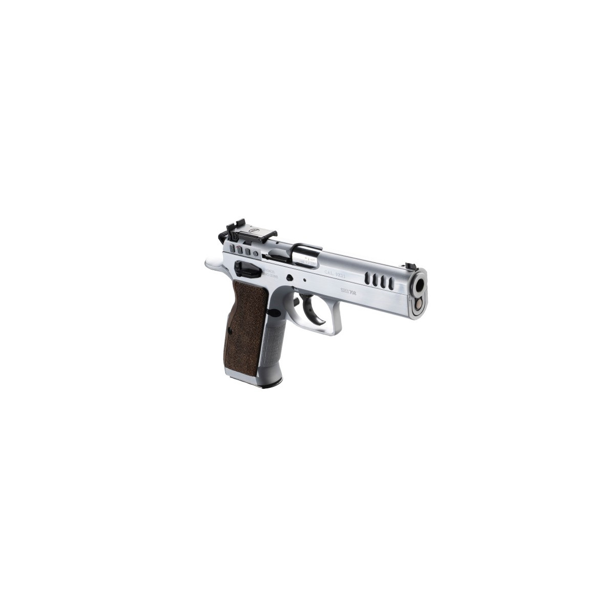 Pistola semiautomatica de doble acción para IPSC-clase Producción. En este modelo, el cañón lleva la parte externa tronco cónica, y es poligonal para una mejor precisión y durabilidad. Armazón largo hasta el final de la corredera para un mejor balanceo de la pistola. Retenida del cargador custom y cachas de madera.