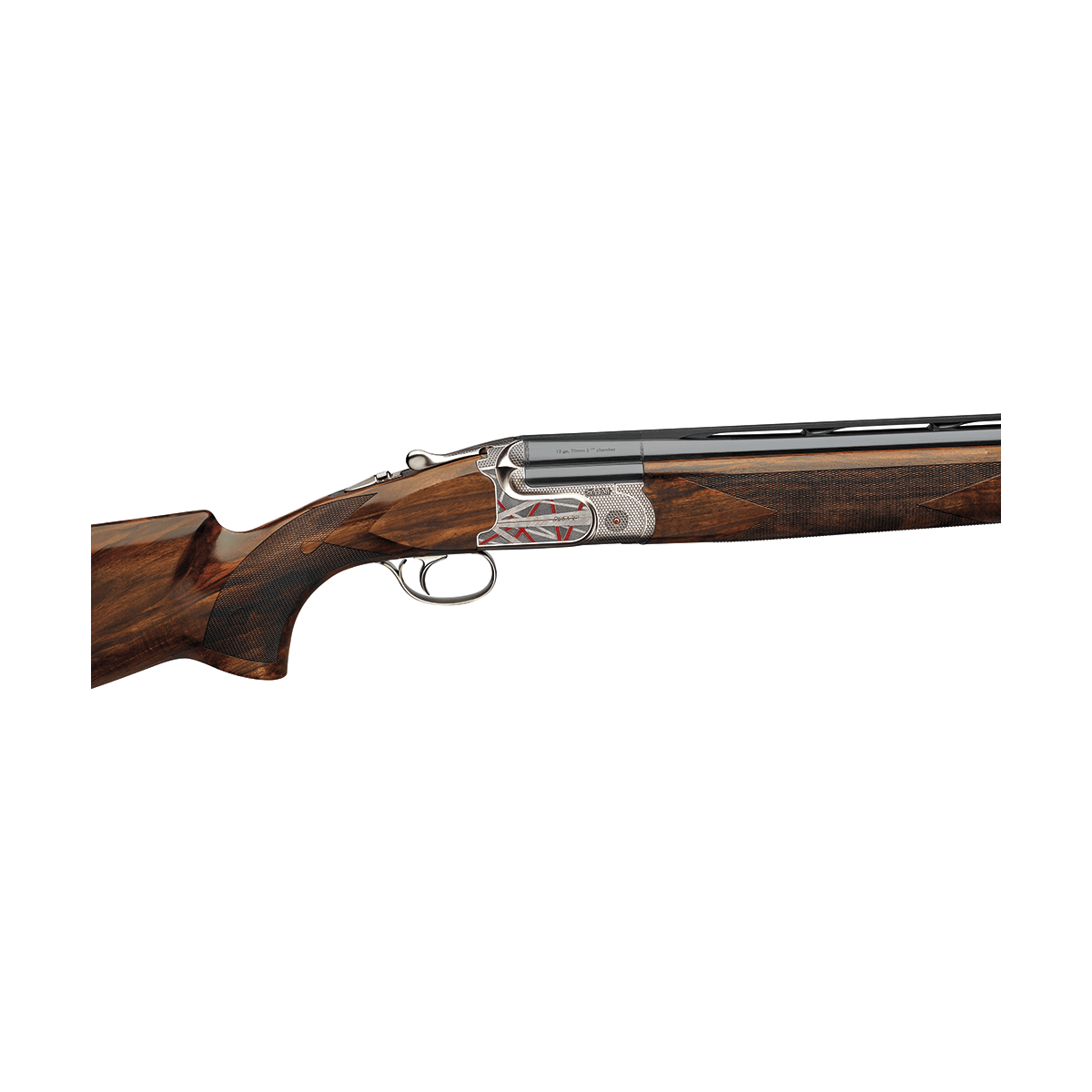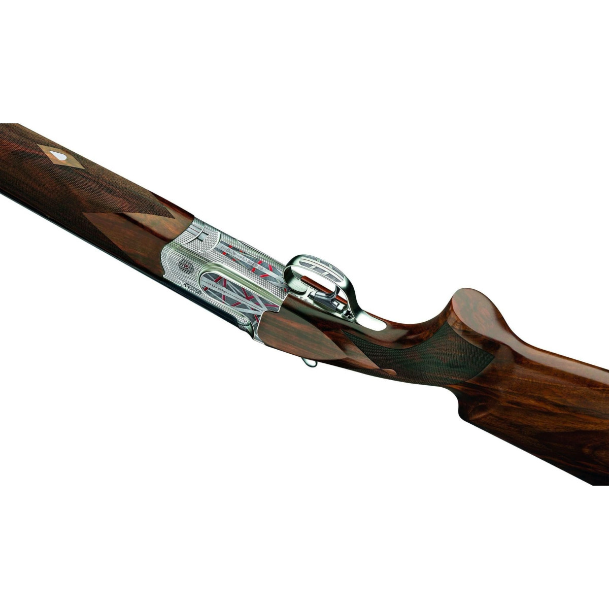 El maestro grabador Dario Cortini ha creado un estiloso grabado contemporáneo único para la ARTCO, utilizando acentos de esmalte rojo con texturas de varios tonos dispuestos en una composición abstracta. Esta interpretación fresca y moderna ha transformado la Invictus en una escopeta de líneas equilibradas con un atractivo artístico excepcional.