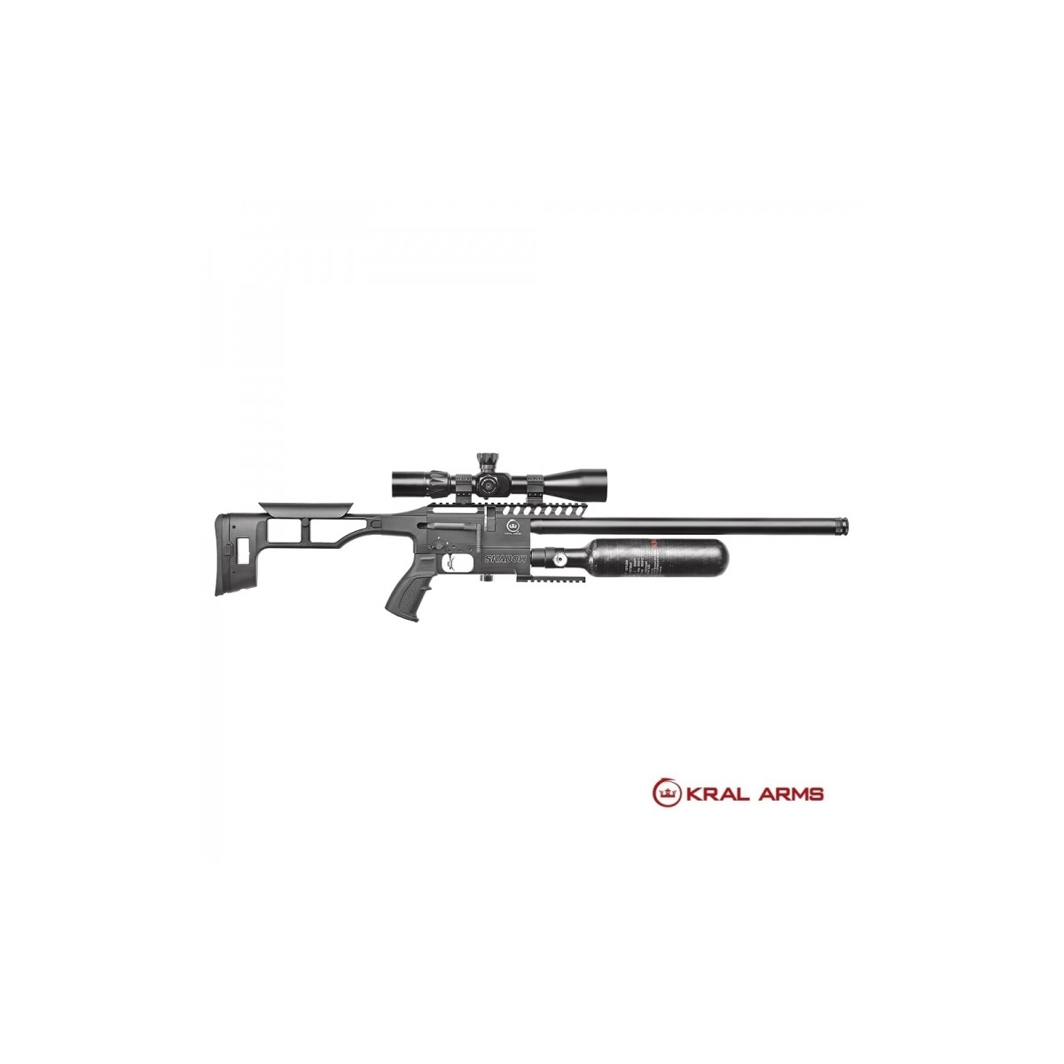 CARACTERÍSTICAS: - VISOR NO INCLUIDO!! - Botella de aire de Carbono. - Capacidad de la botella : 500 cc.. - Presión de llenado: 250 Bar. - Culata Plegable Sintética de Alta Calidad. - Carrillera y Cantonera ajustables. - Largo cañón: 53 cm. - Largo total: 105 cm. - Peso: 3,50 kg. - Se carga por palanca lateral. - Gatillo ajustable manual. - Regulador de presión con manómetro independiente a 110 bar.(de origen)