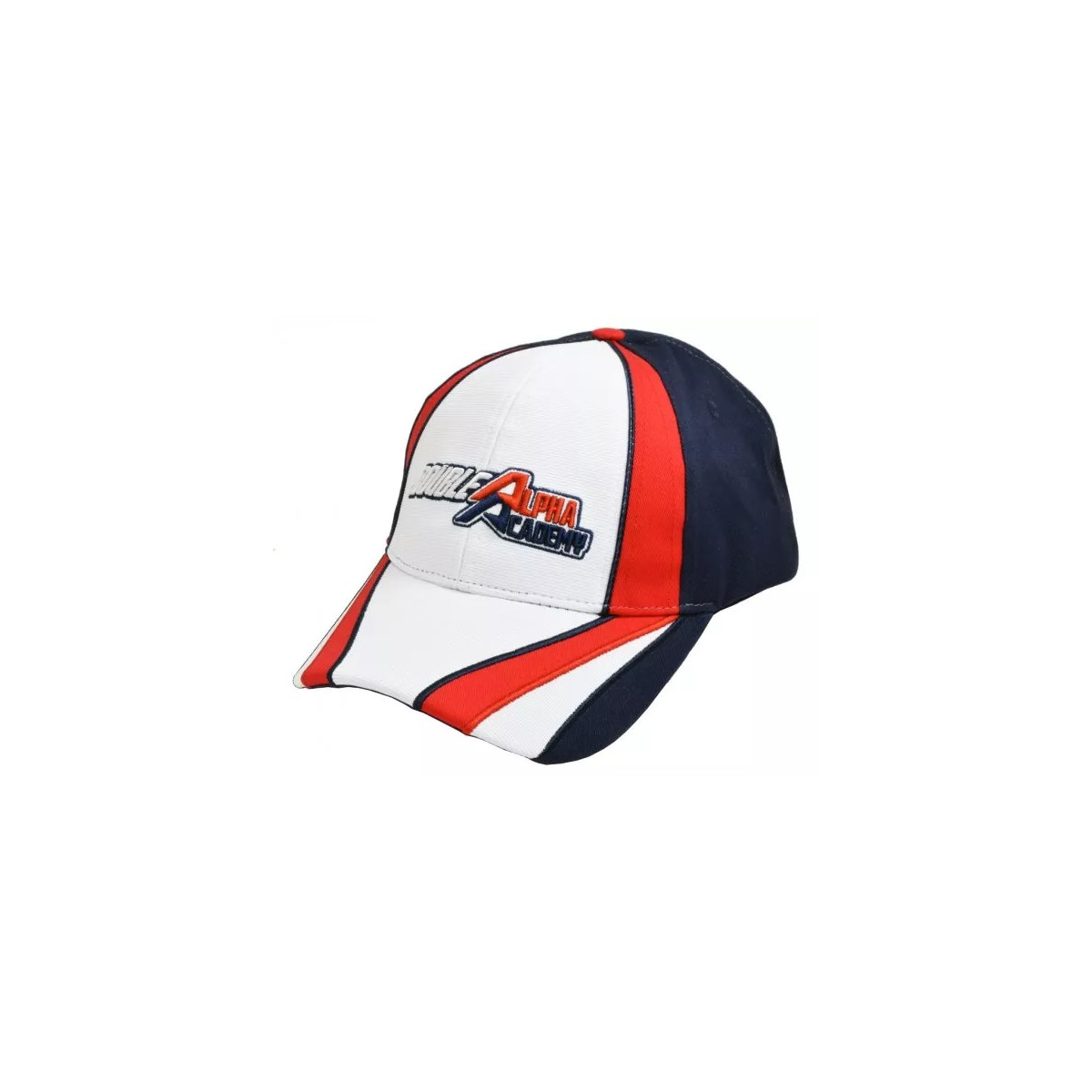 Una gorra elegante de alta calidad, estilo béisbol, en esquema de colores blanco, rojo y azul marino.