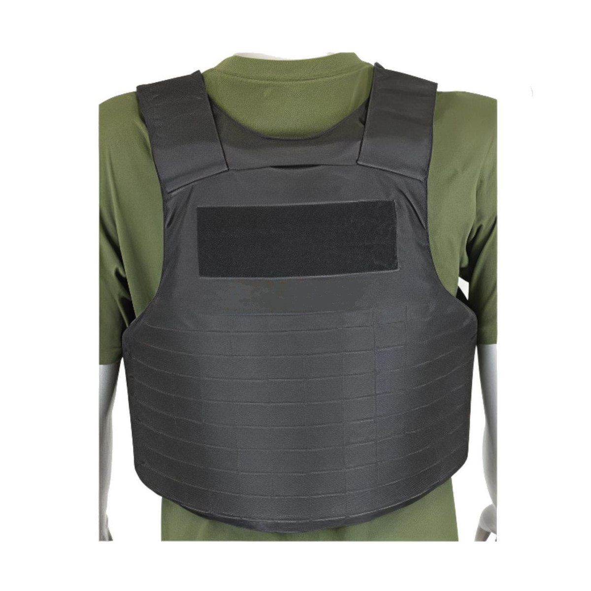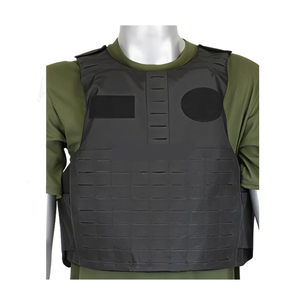 La protección principal se basa en 2 placas de acero desmontables (pecho y espalda), fijadas mediante velcro para poder retirarlas en operaciones de limpieza del chaleco. El ajuste se realiza mediante cinta elástica y velcro, permitiendo regular contorno y altura. Además, incorpora el sistema MOLLE “Laser cut” y paneles de velcro en la parte frontal y trasera, facilitando la fijación de accesorios compatibles.