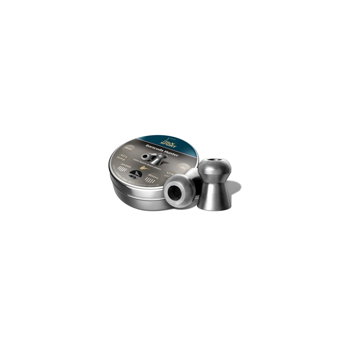 Balín de caza pesado, extraordinariamente preciso para distancias largas. Modelo Baracuda perfeccionado con las mejores propiedades aerodinámicas para un máximo poder de perforación, alta profundidad de penetración y deformación controlada de la bala. Agrupaciones pequeñas. Emplomado muy bajo y agrupaciones homogéneas gracias a la aleación especial y engrase. Liso con punta hueca profunda